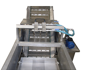 同時,滿箱的物料箱被自動輸送到輥筒輸送線上,由操作人員處理。浸水輸送裝置可使膠料冷卻并防止膠料碎屑相互污染。水箱內(nèi)有余料箱,方便取出清理。當冷卻輸送機上無膠料時,空運行5分鐘后,即自動停機。